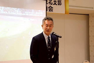 総会でははじめに鶴田有司支部長が、明治大学が、数多くの文豪が愛した「山の上ホテル」を昨年11月に取得したことや、大学が教育面で高い評価を受けていることに触れ「明治が世界に開かれた大学になることを期待したい」とあいさつしました。