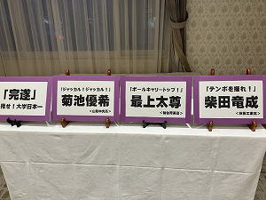 締めの校歌斉唱では、こちらも恒例となりました加藤事務局次長の力強いエールのもと、「おお明治」がどこよりも大きな声で会場に響きわたりました。