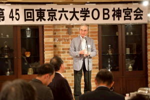 続いて来賓の岸上謙司・総務担当常勤理事、大平幹夫・校友会副会長から祝辞をいただきました。祝辞のなかで、岸上さまからは、駿河台キャンパスの総合施設整備計画など、創立150年向けて進むさまざまプロジェクトについてご説明いただき、大平さまからは「『明治の財産』である卒業生の多くと連絡が取れるコミュニティーのさらなる活性化をお願いしたい」とお話をいただきました。
